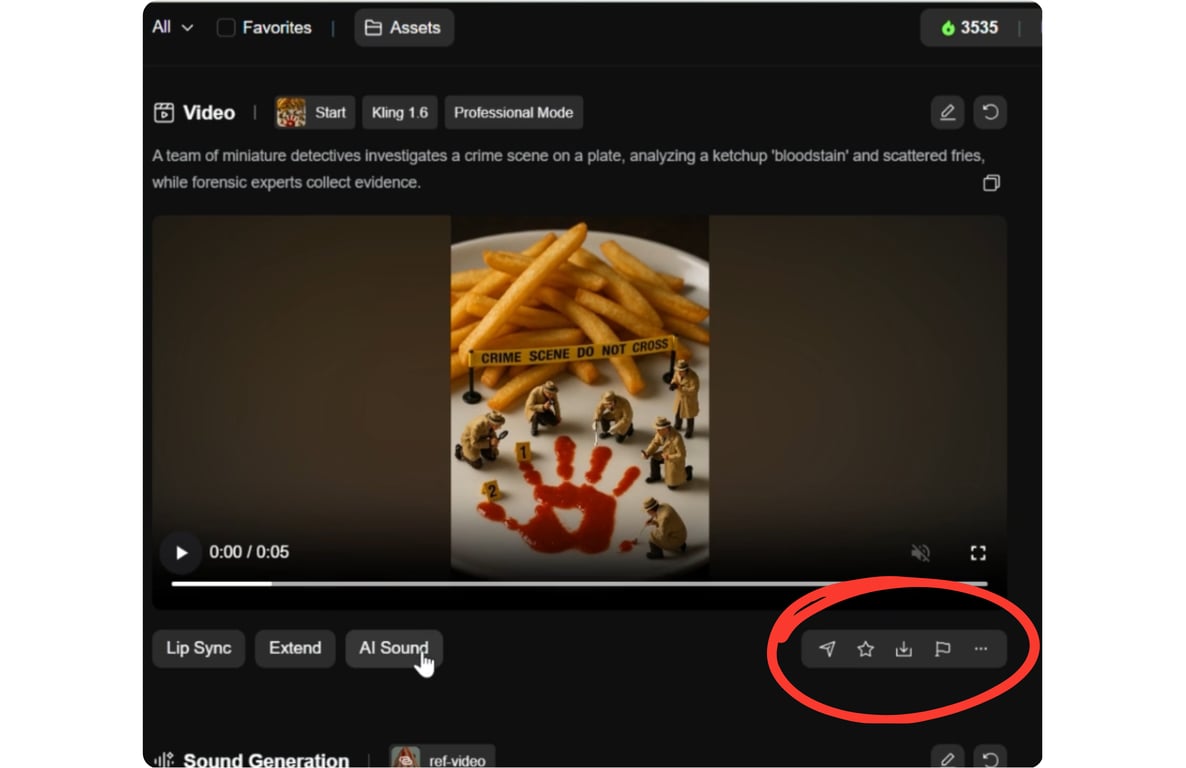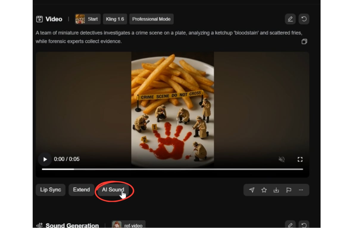 To make the scene more immersive, use Kling’s built-in AI Sound feature. Look for a button or option labeled “AI Sound” after your video is generated (often next to the download or playback controls). Click this, and Kling AI will automatically create a soundscape for your clip.