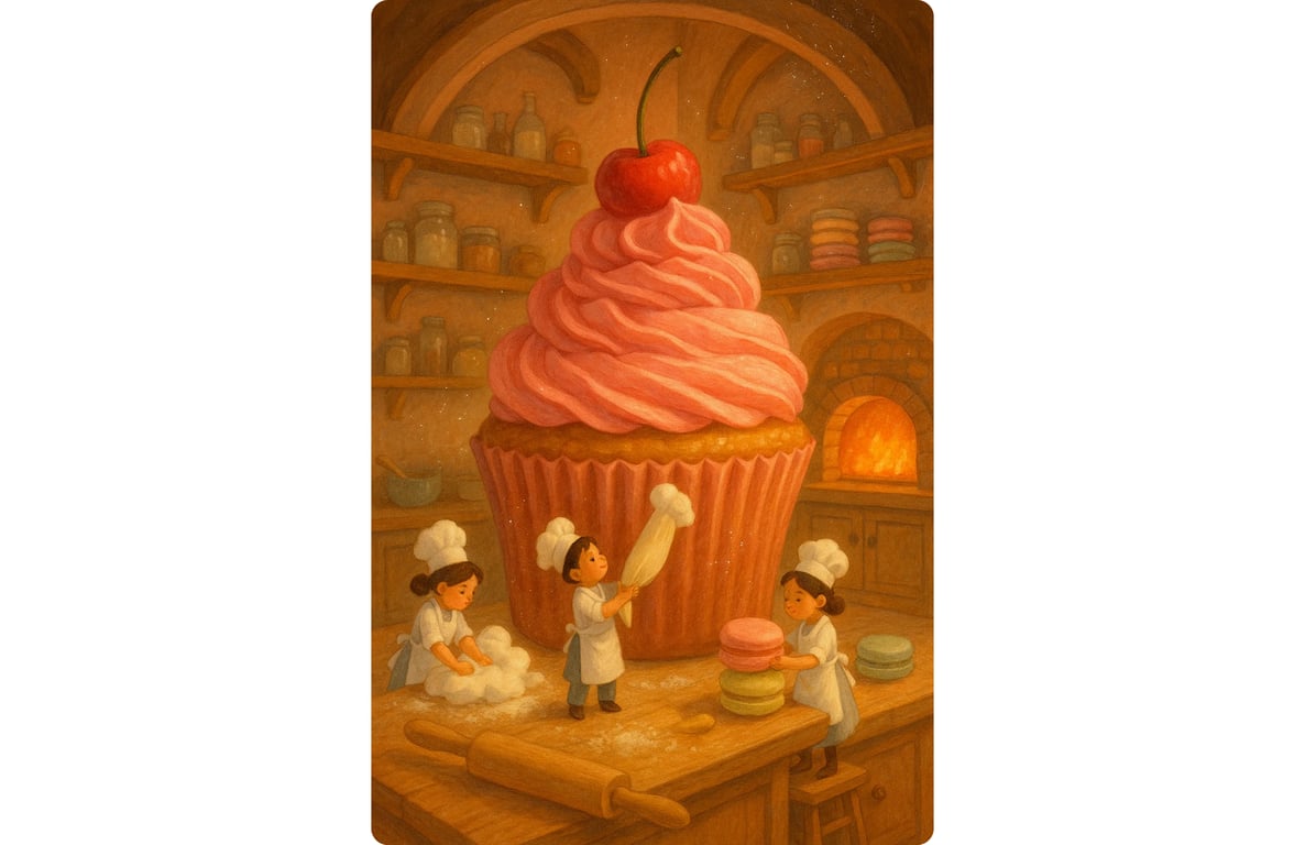 Miniature pastry chefs craft giant desserts, carefully baking, decorating, and adding the final cherry on top of a cupcake.