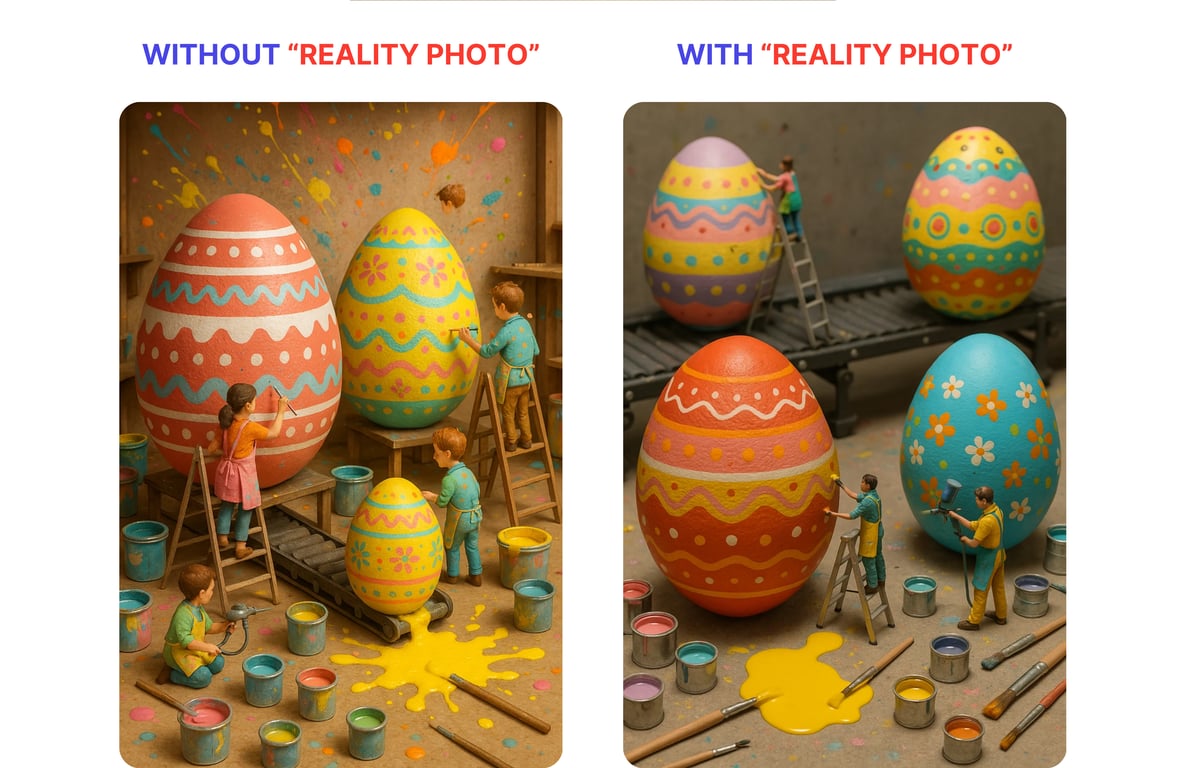 Reality photo of giant Easter eggs in a miniature workshop, with tiny artists in colorful aprons painting intricate patterns, using ladders, airbrushes, and pastel paints. Paint cans, brushes, and a conveyor belt scatter around, while some spill bright yellow paint laughing. Vibrant, colorful splashes set a playful and festive Easter mood.
