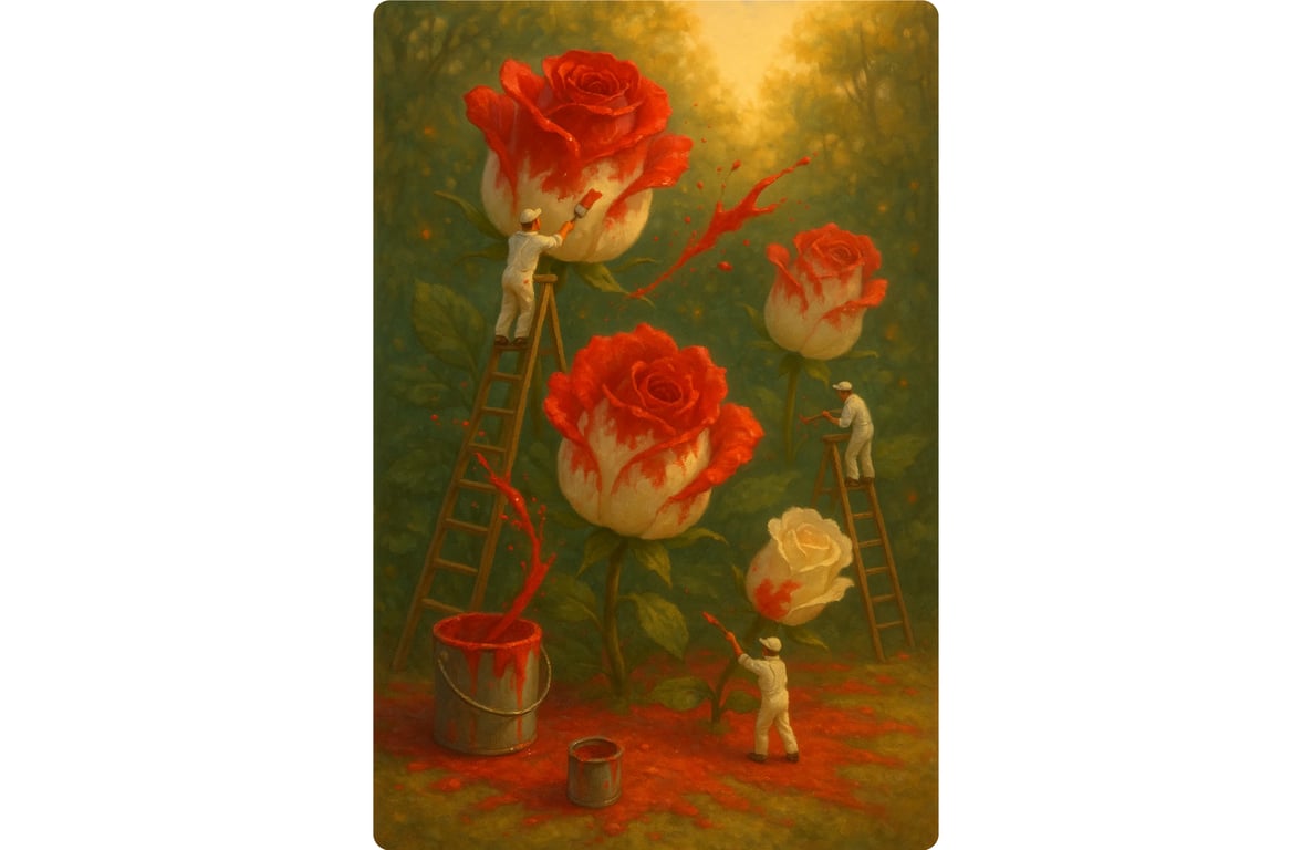 Miniature painters meticulously coat white roses with vibrant red paint, transforming them petal by petal.