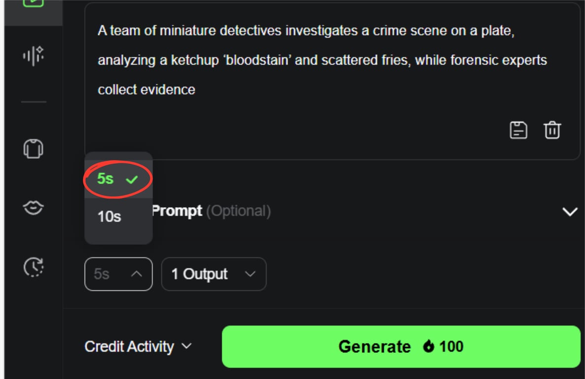 When choosing the clip duration, Kling AI offers 5s and 10s options. It's best to pick 5s for the most realistic motion. Choosing 10s may cause unnatural movements and more errors. Shorter clips also generate faster and look cleaner.